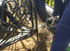 Предварительно убрав уже выросшие сорняки, мы привариваем к ножкам ограждения металлическую полосу. Она обозначает периметр участка и препятствует высыпанию крошки за его пределы.