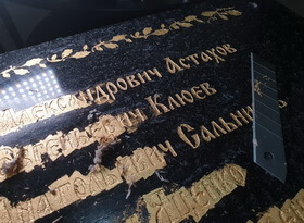 При помощи лезвия от канцелярского ножа мы зачищаем надпись – здесь важно не поцарапать гранит, но в то же время давить с достаточной силой, чтобы соскрести лишнее золото с каменной поверхности.